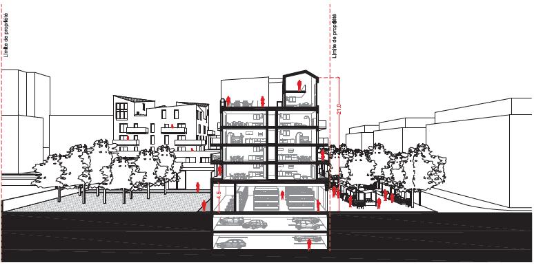 Coupe perspective sur l’îlot O.3 : illustration de la mixité programmatique et de la gestion des vues