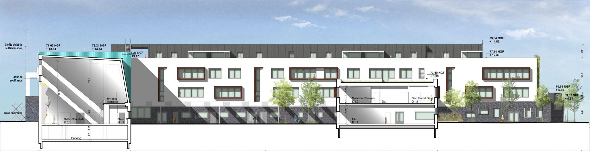 Coupe longitudinale sur la salle d’escalade, la cour et le bâtiment administration-CDI