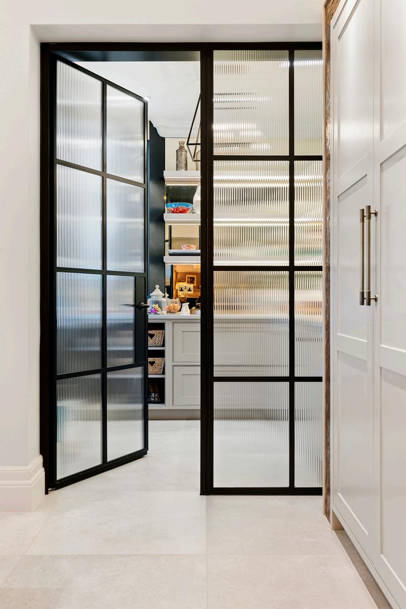Thebuilt-incabinetryiselegantlyframedwith luxuriousliquidmetalaccents,lendingasense ofrefinementtothespace Thewalk-inpantry, accessedthroughelegantCrittalldoors,serves asacharmingyetpracticaladdition,offering amplestoragespacewhileenhancingthe overallaestheticappealofthekitchen
