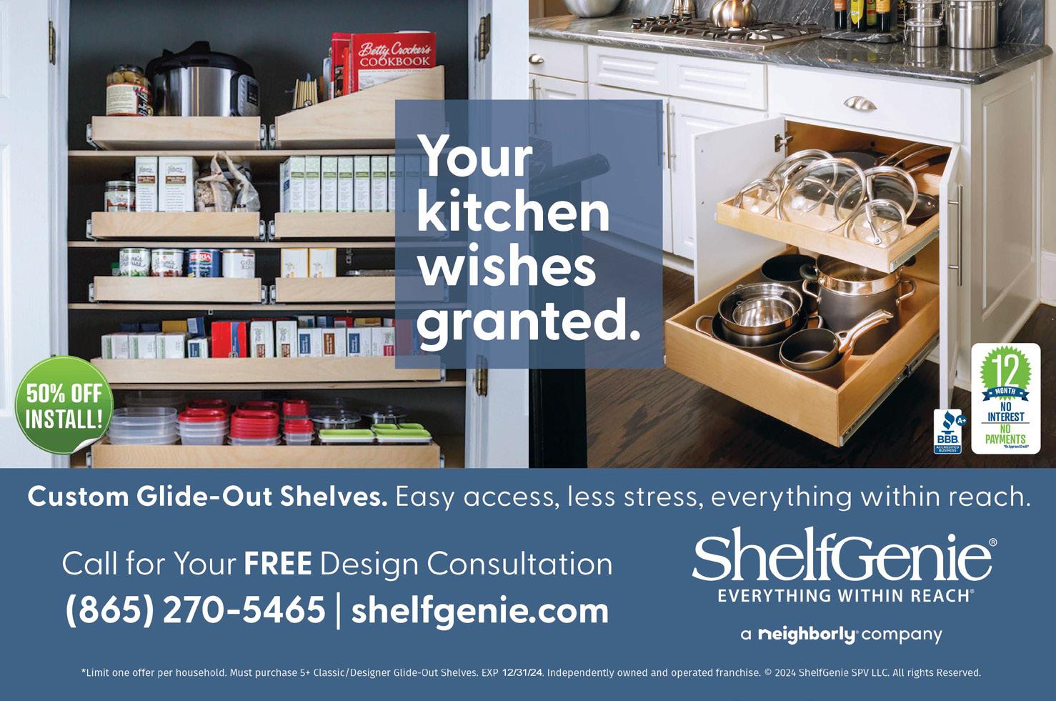 Schedule Your Free Design Consultation Today! One of our talented ShelfGenie designers will come to your home and create a design plan customized just for you –no obligation required. Call us at 865.270.5465 or Sign Up at ShelfGenie.com. ShelfGenie® 865-270-5465 www.shelfgenie.com