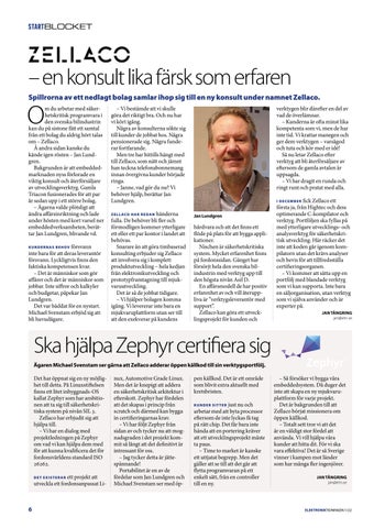 – Vi bestämde att vi skulle göra det riktigt bra. Och nu har vi kört igång. Några av konsulterna sökte sig till kunder de jobbat hos. Några pensionerade sig. Några funderar fortfarande. Men tre har hittills hängt med till Zellaco, som nätt och jämnt han teckna telefonabonnemang innan övergivna kunder började ringa. – Janne, vad gör du nu? Vi behöver hjälp, berättar Jan Lundgren. Z E L L ACO H A R R E D A N händerna fulla. De behöver bli fler och förmodligen kommer ytterligare ett eller ett par kontor i landet att behövas. Snarare än att göra timbaserad konsulting erbjuder sig Zellaco att involvera sig i komplett produktutveckling – hela kedjan från elektronikutveckling och prototypframtagning till mjukvaruutveckling. Det är så de jobbat tidigare. – Vi hjälper bolagen komma igång. Vi levererar inte bara en mjukvaruplattform utan ser till att den exekverar på kundens
