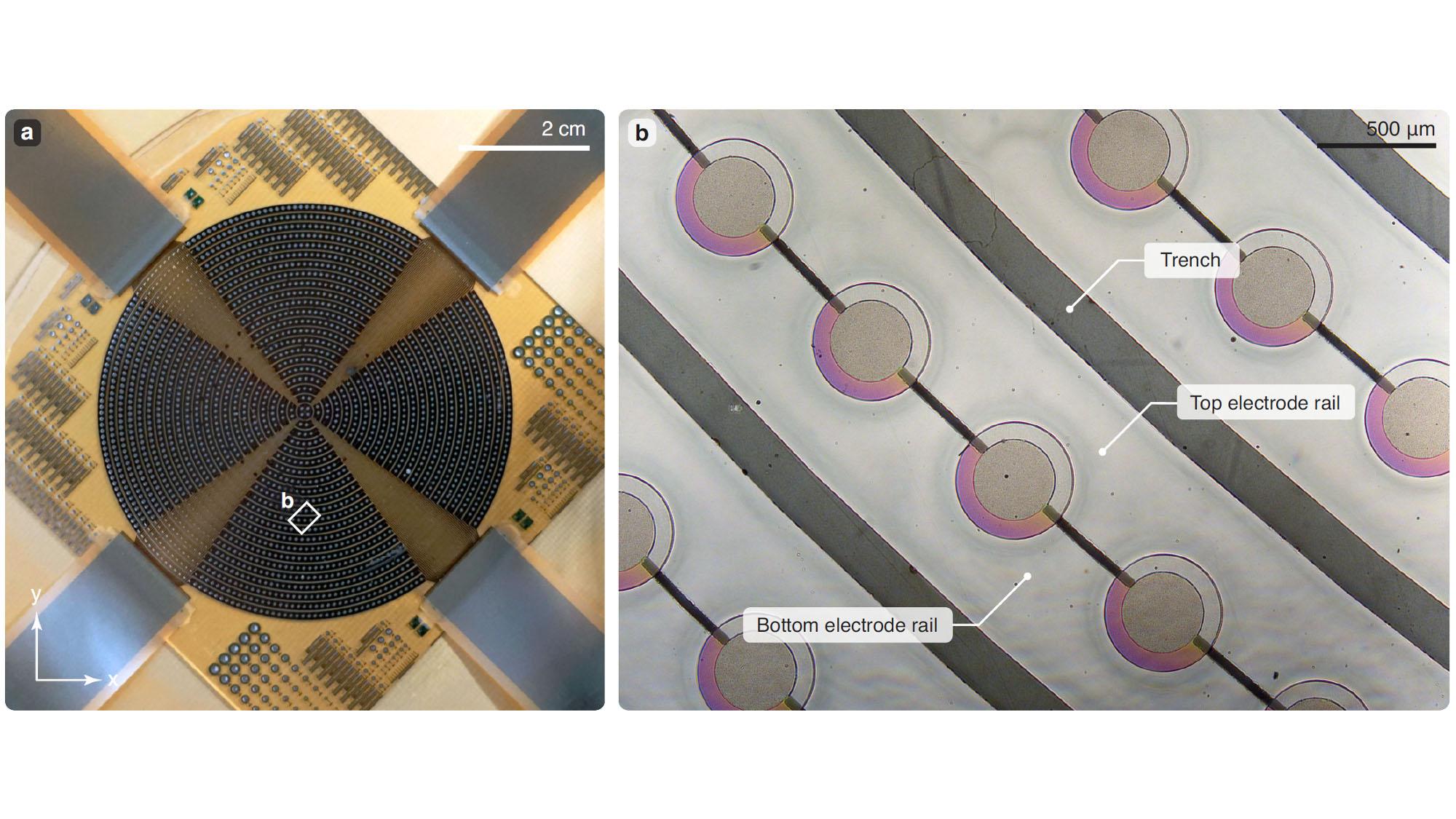(A) A large area pMUT array consisting of 22 phased annular rings of 500 µm diameter pMUTs (B) Detail. With pMUT arrays it is possible to implement gesture recognition and ToF sensing into different size displays. This pays way to new user interfaces in many applications.