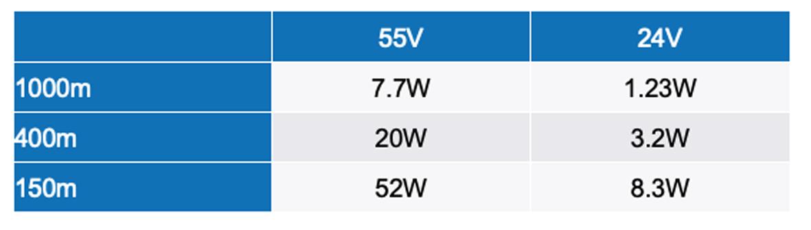 Table 3 provides an overview of the possible power transmission levels for the various line lengths and areas for a Type 18 AWG cable