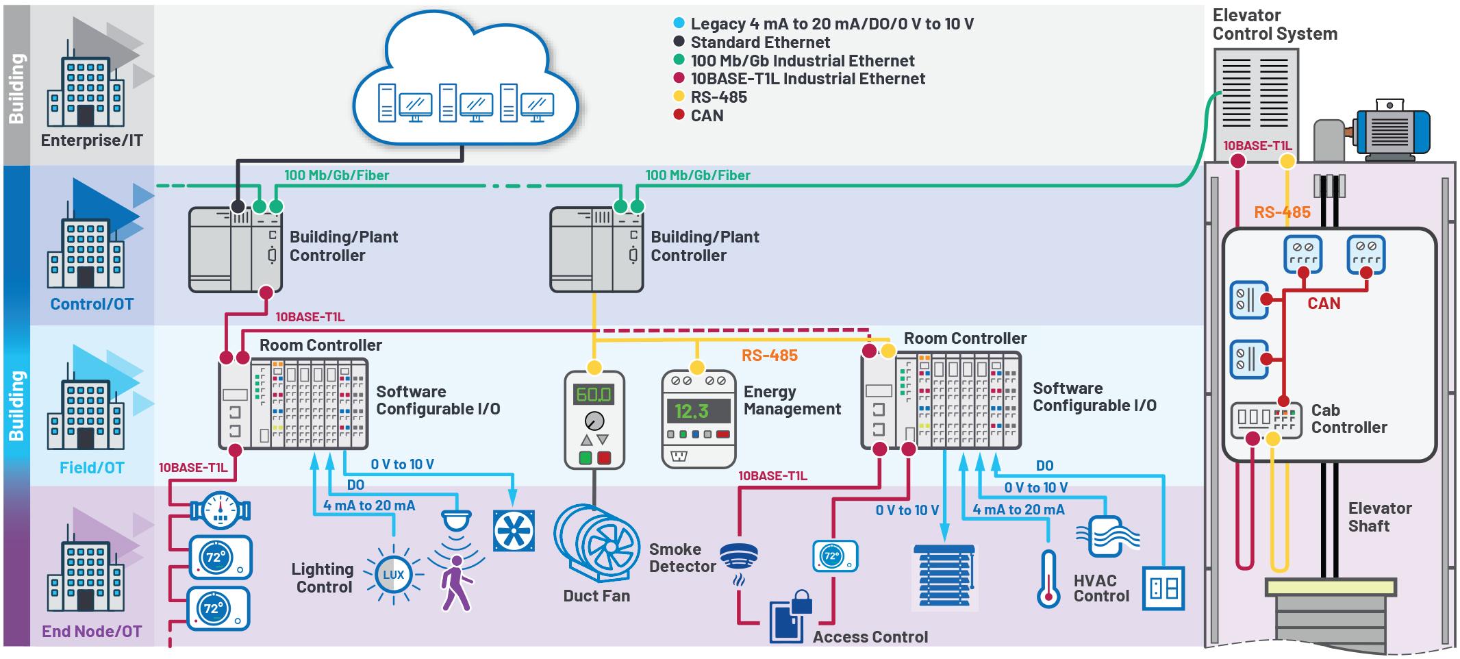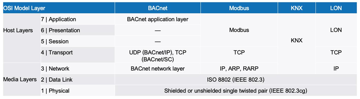 10BASE-T1L offers the possibility of using the existing 2 wire infrastructure to realise line lengths of up to 1000m at a transmission speed of 10Mbps The physical Ethernet technology is defined exclusively in Layer 1 (the bit transmission layer or physical layer) of the Open Systems Interconnection (OSI) model. Above the bit transmission layer, 10BASE T1L supports common Ethernet protocols such as PROFINET, Modbus, etc , as well as other bus systems, such as BACnet, KNX, and LON, that are commonly used in building management systems. Table 1 shows an overview.
