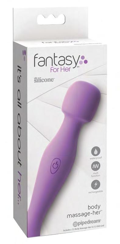 Purrs Like a Kitten is an app-compatible two-piece wand and cock ring kit. The liquid silicone wand features a bendable neck and a cat-shaped head designed for internal or external stimulation. It has five vibration intensities across seven patterns. The remote control doubles as a wearable vibrating cock ring.
