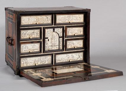 These captivating cabinets were an essential part of a nobleman’s Kunstkammer, a room containing furniture and objects showcasing the collector’s taste and education. Their function was to contain precious objects including coins, medals and private correspondence. They were architectural in form and symmetrical in design, typically with a central door surrounded by rows of drawers with engraved ivory panels. Made from exotic materials imported at considerable expense, they also reflected the wealth of the patron.1 Spain gained a monopoly on the trade in Indian ivory and