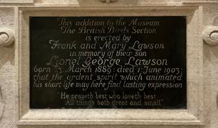 Memorial plaque to Lionel George Lawson (RSK 1903) in whose memory the Natural History Museum annexe was built