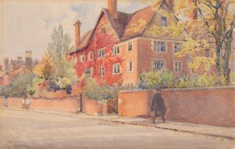Davison specialised in painting marine scenes before taking up residence above the old Post Office on the High Street in Eton in 1913. She was in her late 50s and embarking on a new phase of her career, capitalising on local demand for views of the streets and buildings of Eton College. Her works sold mostly to Eton Masters, boys and their families, for whom she became ‘a familiar figure, sitting on her camp-stool, often with a cluster of boys looking on as she painted some Eton building’.