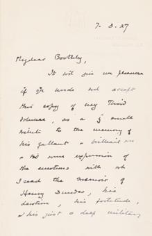 The Macnaghten Memorial Library, which forms part of Eton’s rare book collection, is now the home of a copy of Winston Churchill’s The World Crisis 1916-18, presented by Churchill in 1927 as a gift in memory of an Old Etonian who fell in the First World War. It is accompanied by a letter signed by Churchill. These items complement an archive in the library relating to Henry Dundas (CHKM, 1915), who died in the war, and who had been considered one of the most promising Etonians of his generation, with a glittering political career ahead of him.
