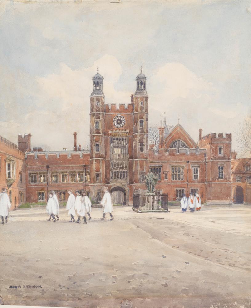 Late last year the Collections received a significant bequest from Charles Nugent (CNCA, MCM, ‘79): 17 watercolours, 16 by Nora Davison (1855–1950) and a single example by friend and fellow artist Mabel Spurrier (1881–1979). Nugent’s carefully selected works span Davison’s output as a marine painter, but focus on her later career at Eton, where she recorded buildings and events at the College. Nugent’s career in the art world included working in the British Drawings & Watercolours department at Christie’s, London, and as a curator at the Whitworth Art Gallery, Manchester. This bequest will feature in a forthcoming exhibition on Davison, opening in the Verey Gallery in May 2025.
