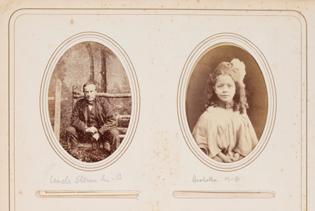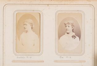 Photograph album compiled by Maria Elizabeth Moulton-Barrett containing a carte-de-visite photograph of Arabel as a girl next to one of her father (above), and one of her as a young woman next to one of her sister Eva (below) (ECL MS 681)