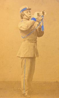 Photographer Richard Beard patented a method of painting on the fragile metal plated Daguerreotype in 1842. After the demand for miniature portraiture reduced with the rise of photography, professional artists were employed in photographic studios instead. A silver gelatin print in our collection from 1894 (PA-PSR.1:13-2023) is one such example of this. The detail of the colour additions makes this photograph seem like a painting, so it was most likely completed by an artist employed by the photographer, in this case, Hills and Saunders. Individuals also coloured aspects of their own photographs, as seen on the carte de visite type, PA-A.15:54-2013, c.1861. This boy’s corps uniform has blue stripes coloured to signify the company and rank he served in during his time in the Officer Training Corps at Eton.