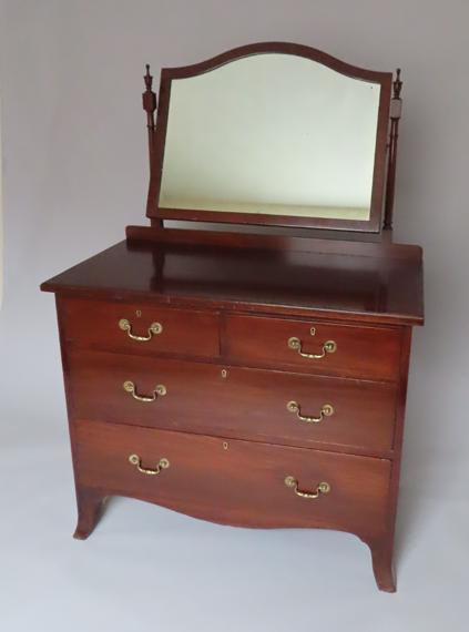 This dressing table may have been used by Eton boys since it was made - probably during the Edwardian era (1901-14). It is made from mahogany and has a rectangular top with an arched mirror erected on the rear side. Contrary to the Victorian era that saw the rise in furniture that was rather fanciful and bulky, and adopted a ‘more is more’ belief, Edwardian furniture turned towards practicality and simplicity in terms of colour and ornamentation. This dressing table displays a harmonious blend of form and function; for example, the mirror surmounted by a plinth and neo-classical urn finial is also able to swivel, so it can be angled towards the viewer.