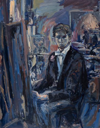 by 65cm and uses oil on panel to depict him in three-quarter length, seated before an easel in the Drawing Schools.