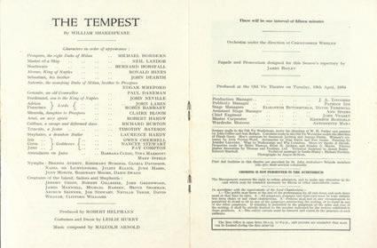 The Theatre World critic described the music in the 1954 Old Vic production of The Tempest as ‘entrancing’, a perfect accompaniment to Shakespeare’s play, carrying the audience away with delight, wonder and rapture. Such high praise, shared by most of those who saw the play, was a tribute to the work of the young composer Malcolm Arnold, who had been commissioned to undertake the task by the director Robert Helpmann after he had heard Arnold’s ballet music to Homage to the Queen at Sadler’s Wells.