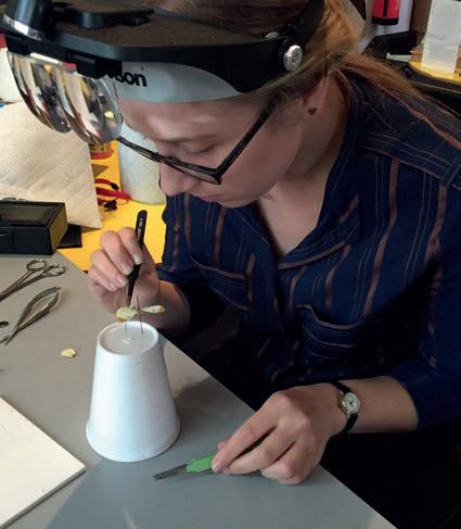 The final problem we tackled was how to reconstruct the body of the butterfly if it had been damaged or lost but the wings still remained. As before a strip of Gampi tissue was coated in adhesive and then rolled into a long cylinder and a pin put through the middle. Once the adhesive was dry to the touch the roll was able to be shaped and trimmed to size. When completely dry the