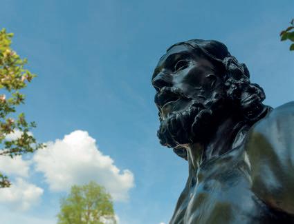 In a sheltered glade formed between the building and a magnificent magnolia that dominates the lawned area of the garden the Rodin figure strides confidently, his expressive arms outstretched as he prepares the way for the ministry of Jesus.