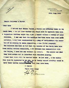 than ever, and had ‘been supplemented by a gang of hobbledehoys who assemble of an evening to smoke cigarettes, & use filthy language.’ The choice of language in these documents was a great source of enjoyment to me during the cataloguing process, and could comprise an entire article by itself. The complaint continues, arguing that the nuisance has become so bad that tenants of the North Mews have been communicating with the police, but to no avail as the police have order not to interfere with children playing. The tenant finishes his letter by claiming that he and his family will soon be leaving the neighbourhood, as they cannot stand to have ‘their nerves wracked in the way that they have been.’