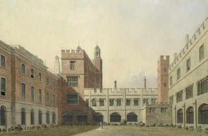 This year the Friends of the Collections generously funded the purchase of a watercolour drawing showing a view of the Cloister at Eton College. They are seen from the eastern side, looking back towards Lupton’s Tower and what is now the Print Room of the Fine & Decorative Art (FDA) collection. Around the edge of the central lawn neat shrubs are visible, as are the Georgian iron railings on the far western side, later removed by architect Edmond ‘Bear’ Warre (1877–1959), son of former Provost Dr Warre.