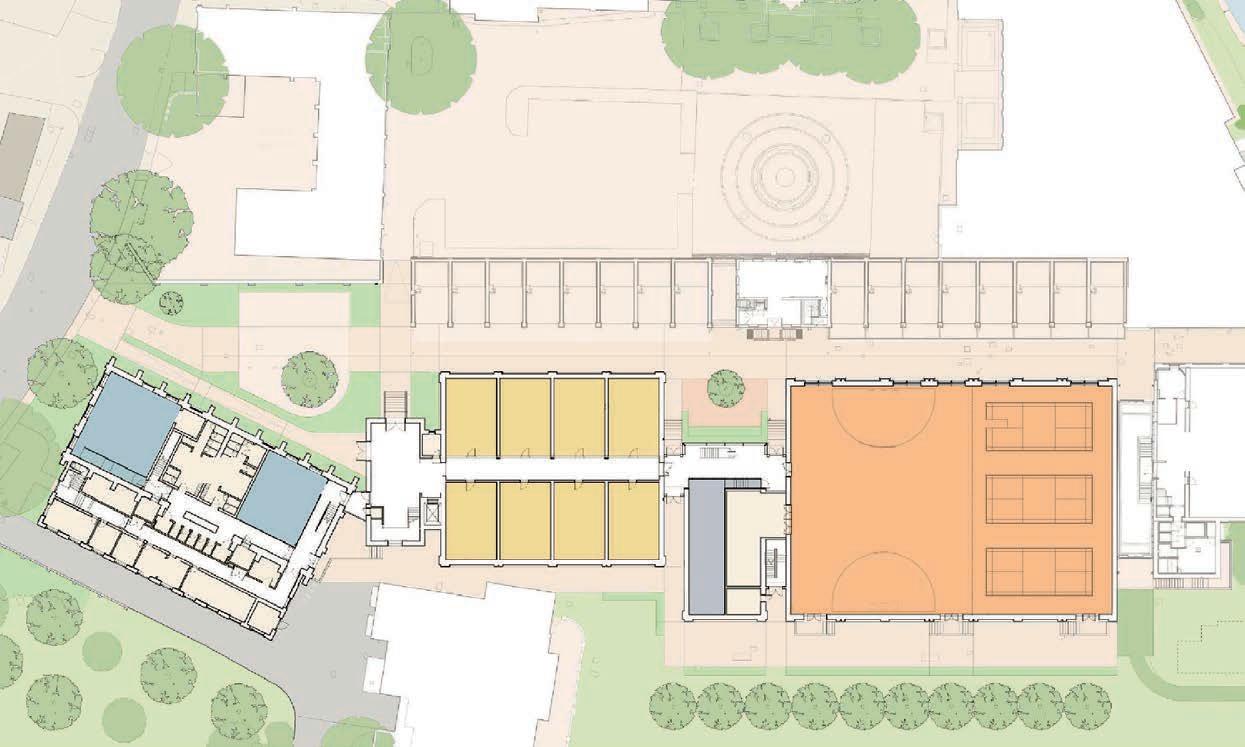 Offset from this will be the entrance hall, with a classroom above leading into the squash courts, a climbing wall and a giant open sports hall beyond.