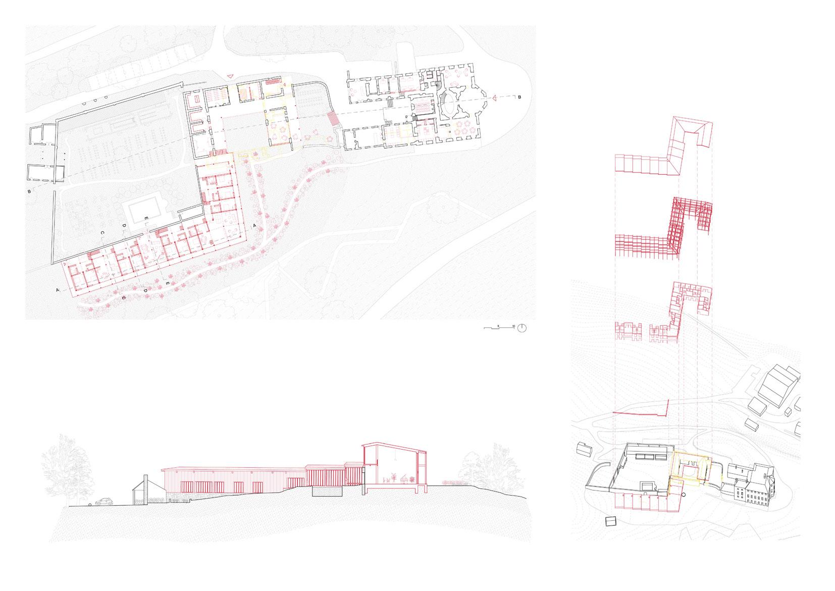 The project aims at strenghening the relationship between these building as well as to develop the in-between spaces of the site for the community.