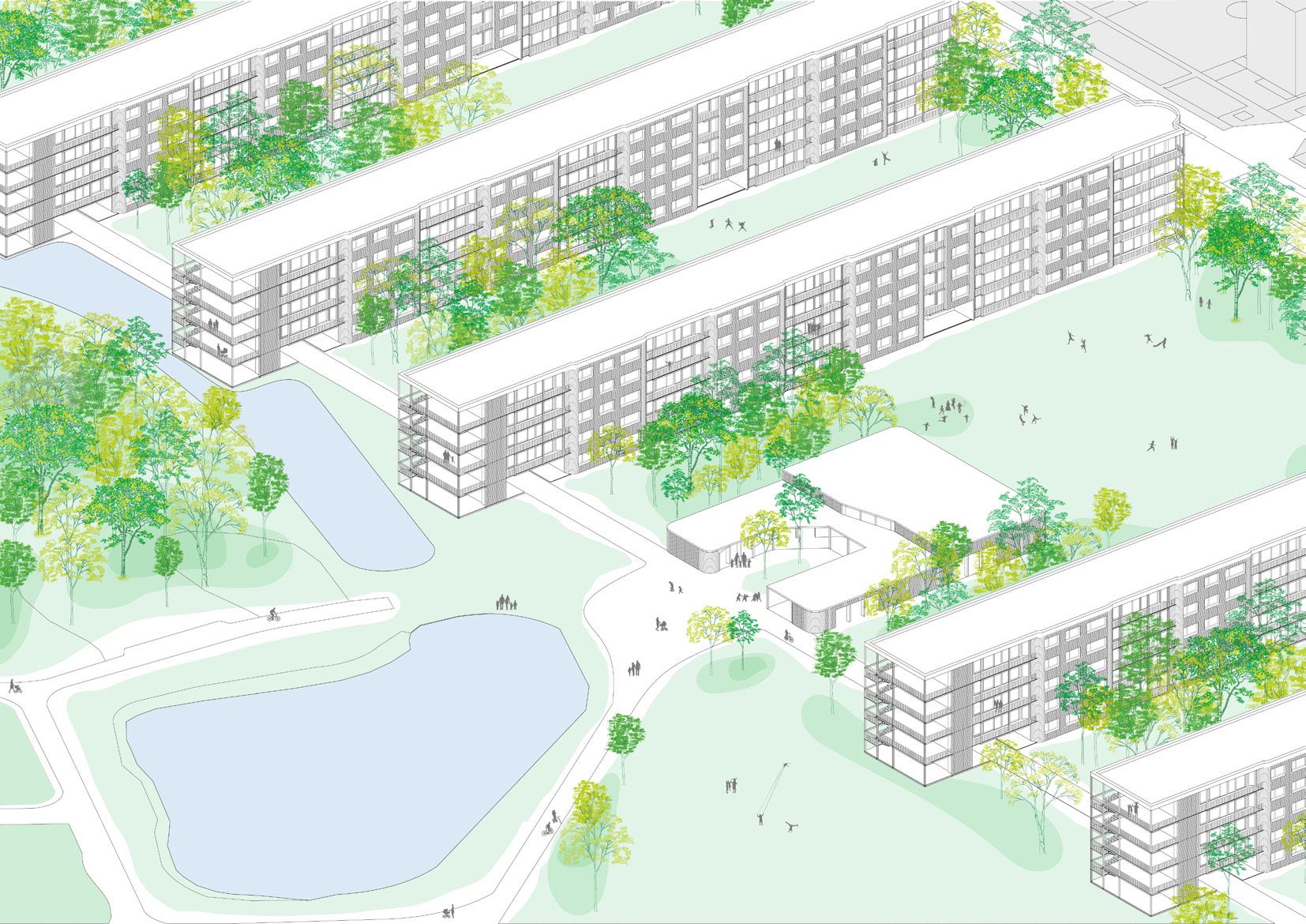 The establishment of a residential area in Blijdorp, Amsterdam (NL) : 10 new buildings that can accommodate up to 480 housing units and a communal center where residents can gather, organize events and cultural activities.
