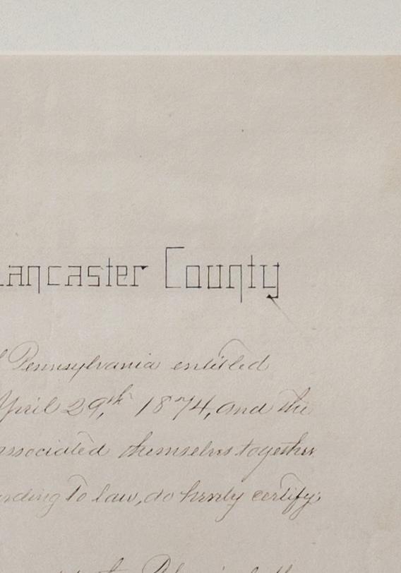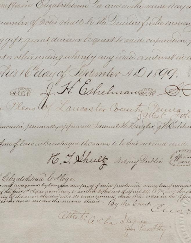 Rare items include minutes from the first Board of Trustees meeting and printed programs from the Nov. 13, 1900 opening exercises and the first Commencement ceremony. Many historical pieces from the Archives were featured across campus during the anniversary year to offer a glimpse at the earliest beginnings of the College, including Etown’s original hand-written charter from the Lancaster County Court of Common Pleas.