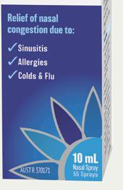 ^Savings calculated on RRP provided by supplier at time of catalogue preparation and may not reflect previous in store selling price. *The percentage savings shown are calculated to the nearest 5% of the actual savings. CHPAUS 30827-1219 Always read the label and follow the directions for use. Research conducted and funded by Rhinocort. Efficacy of Budesonide compared to intranasal corticosteroids and antihistamines in allergic rhinistis. March 2022. Available at Rhinocort.com.au ®Registered Trademark. *Compared to over the counter medicines and equivalent to intranasal corticosteroid sprays 14209 Always read the label and follow the directions for use. ® Registered Trademark FAST A S T ALLERGY A L L E R G Y RELIEF MADE FOR Always read the label and follow the directions for use. ® RegisteredTrademark. AW 98188 SUCROSE FREE GLUTEN FREE DYE FREE GRAPE LIQUID CHEWABLE On Sale Thursday 4 - Wednesday 24 April 2024 On Sale Thursday 4 - Wednesday 24 April 2024 $799ea A. Cal-600 Calcium Supplement 120 Tablets B. Vita-D Vitamin D Supplement 60 Capsules Always read the label and follow the directions for use. SAVE $6.96 OFF RRP^ $2999 ea Melotin MR Support Sleep Quality 30 Tablets Ask your Pharmacist about this product. For the short term treatment of primary insomnia (without an underlying medical or any other clear cause) characterised by poor quality sleep in patients who are aged 55 or over. Not to be used concurrently with other treatments for insomnia. SAVE $7.40 OFF RRP^ $3899 ea Claratyne Hayfever & Allergy Relief 60 Tablets Always read the label and follow the directions for use. FROM $1299 Cenovis A. Mega C 1000mg 60 Tablets $12.99 B. Echinacea, Garlic, Zinc + C 60 Tablets $16.99 Always read the label and follow the directions for use. Blackmores Vitamins Range (Selected Variants) Always read the label and follow the directions for use. 40% 50% SAVE $25.00 OFF RRP^ $2499 ea Lipo-Sachets Vitamin C or Vitamin D 5g 30 Sachets Always read the label and follow direction for use. SAVE $2.00 OFF RRP^ $699ea Maxiclear Nasal Spray 10mL Always read the label and follow the directions for use. SAVE $0.96 OFF RRP^ $1199ea Otifleks Goodsleep or Ladybuds Sleeping Earplugs (Selected Variants)