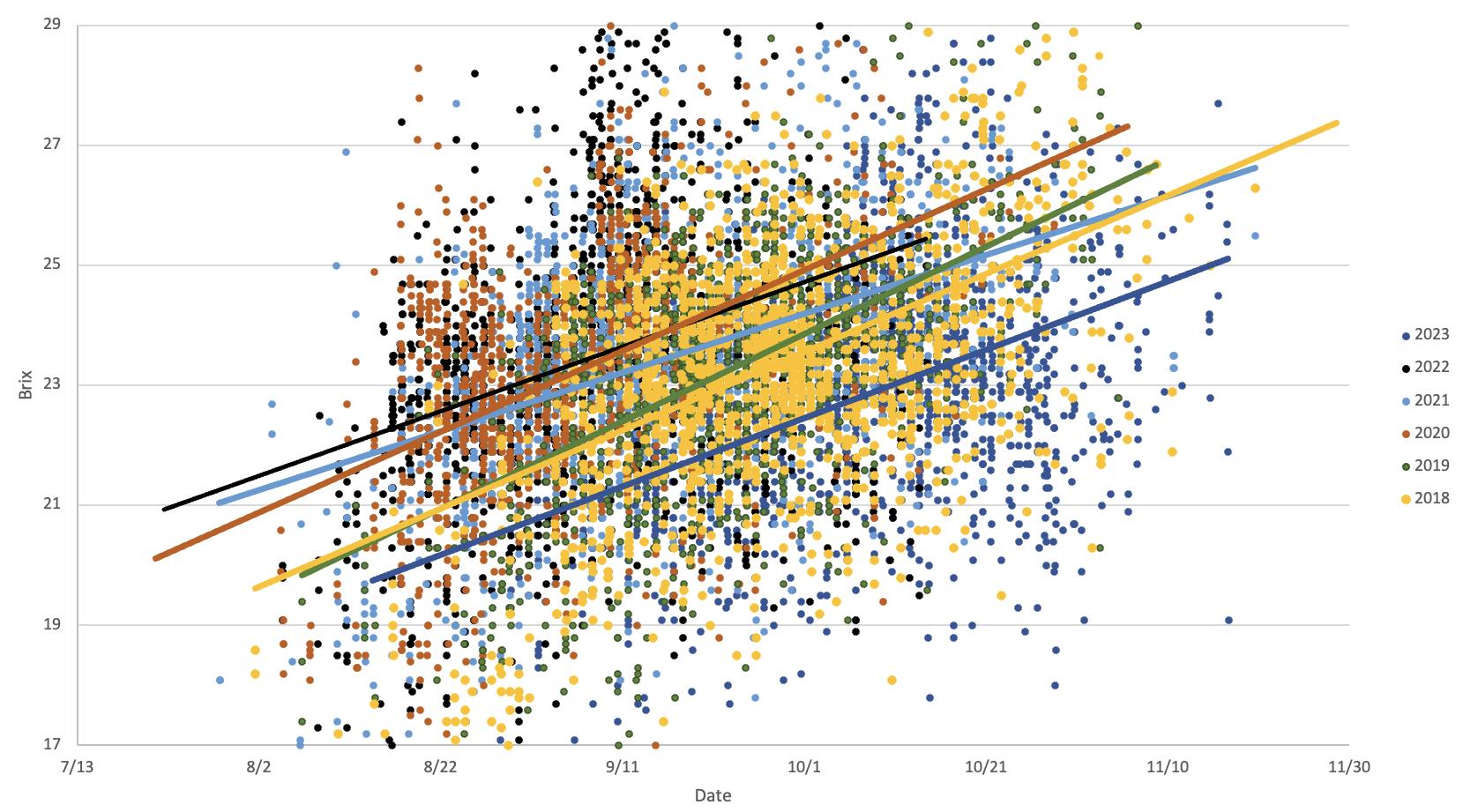 The duration of the sugar loading phase, the time at which this phase ends, as well as the Brix achieved at that time, are all important indicators of wine growing conditions. Excessive or insufficient vigor, water availability, and resistance to heat stress all have an impact. Vines under often desired moderate hydric stress conditions typically reach between 21 and 23 Brix at the end of sugar loading. In most cases vines with excessive vigor see their sugar loading stop before these levels are reached, as vegetative growth may compete with sugar synthesis and accumulation. Such vines also often poorly resist heat waves and tend to “shut down” more easily, which can prompt a sudden end of sugar accumulation in berries. At the other end of the spectrum, vines under excessive water stress, subject to nutrient deficiencies or diseased, also have difficulty reaching typical Brix levels at the end of sugar loading.