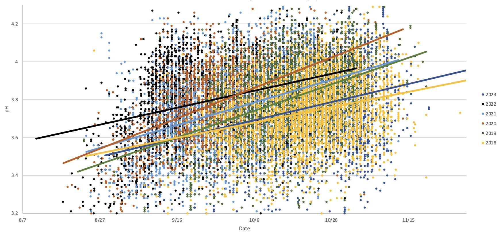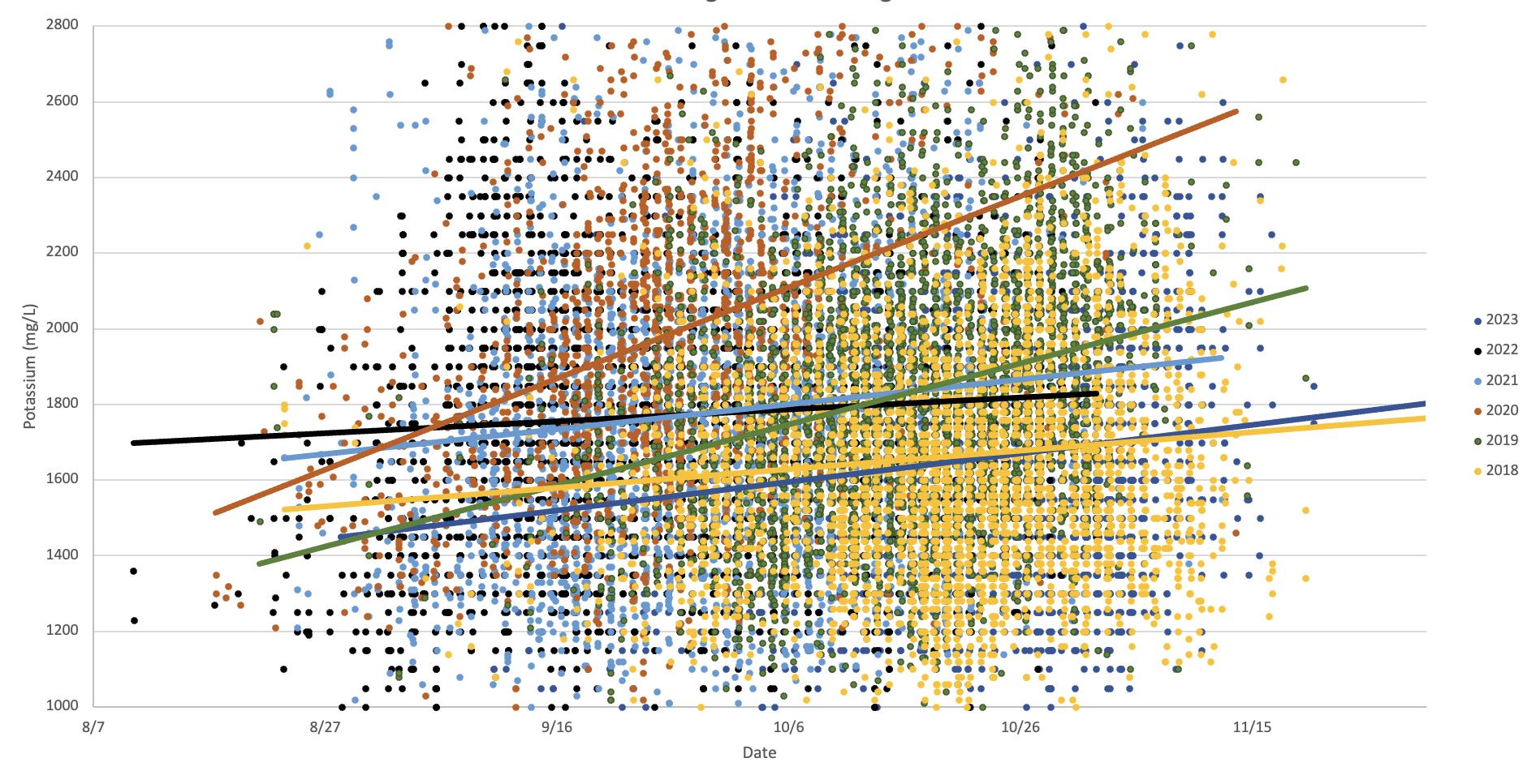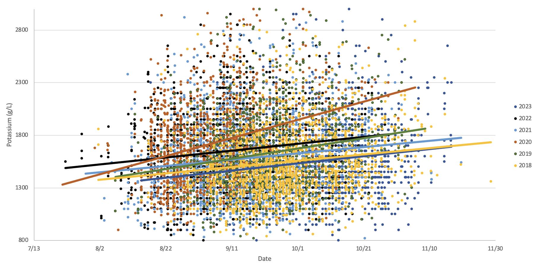 highest near the grape skin. Crushing, skin contact, and pressing all influence potassium levels. Potassium has a strong influence upon pH, acid salt formation, tartrate precipitation, and buffer capacity. Decreases in juice potassium are associated with decreased juice pH. In the 2023 vintage, potassium levels were low which is often observed in cooler vintages.