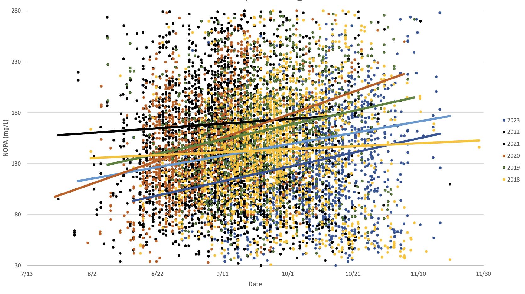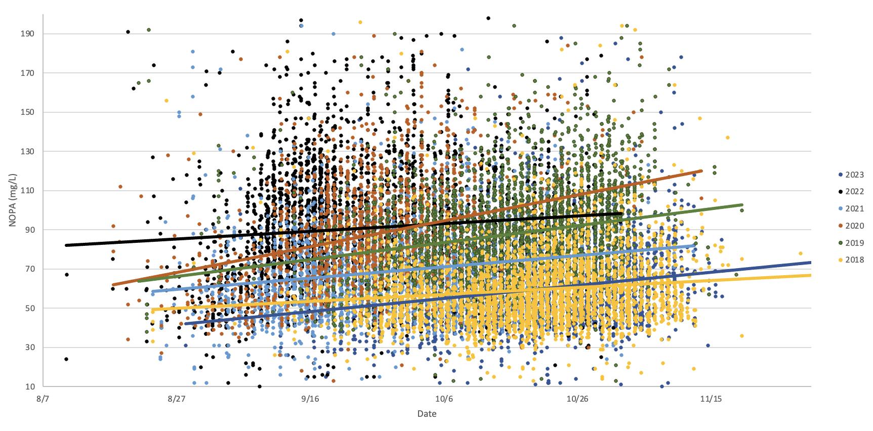 ammonia. NOPA results are expressed as mg nitrogen per liter. NOPA generally trends upward and is usually the largest component of the YAN.