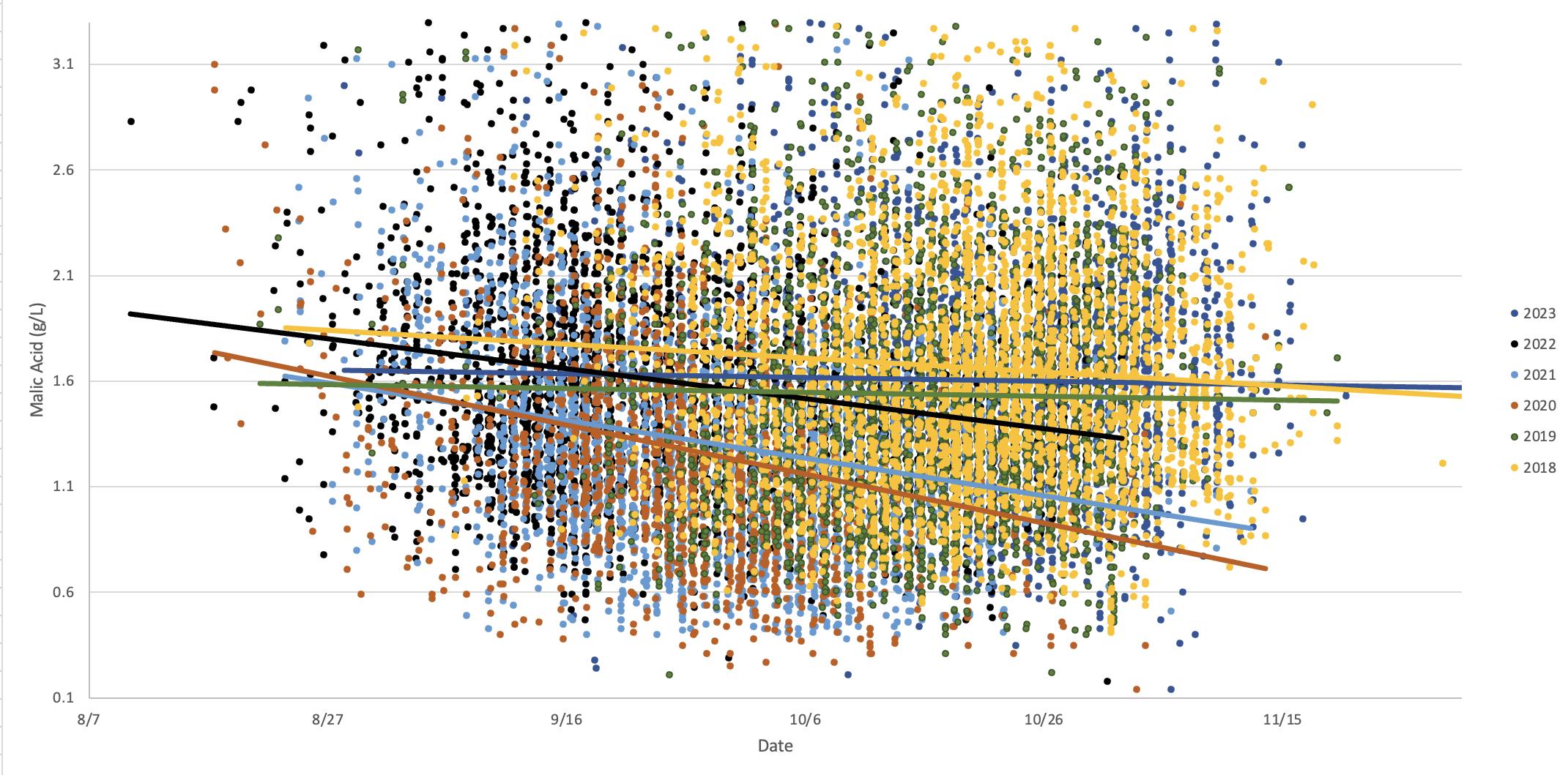 alic acid accumulates early in berry development and declines during ripening due to dilution and respiration. Viticultural practices and grape cluster environments may directly affect respiration rates of malic acid. Malic acid levels affect pH and titratable acidity.
