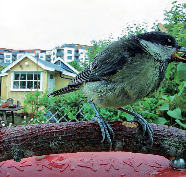 svarttrost, kråke, skjære, blåmeis, pilfink, spurv, kjøttmeis, grønnfink,svartmeis