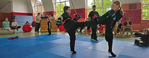 teilungsvorsitzende. – Und Kumite? Beim Training von Ilias Ait Hemmou, dem zweiten Workshopleiter auf dem Lehrgang, ging es um Kontrolle, um Deckung und Finten, um Agieren und Reagieren. Das ist ein schnelles Hin und Her zwischen zwei Sportler:innen, die Punkte erzielen, wenn sie Karatetechniken kraftvoll ausführen, aber dicht vor dem Gegner abstoppen, denn berühren ist nicht gestattet. Schützer sind Pflicht, um Verletzungen auszuschließen.