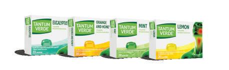 Tantum Verde Lemon, Tantum Verde Mint, Tantum Verde Eucalyptus, Tantum Verde Orange and Honey obsahují benzydamin hydrochlorid.