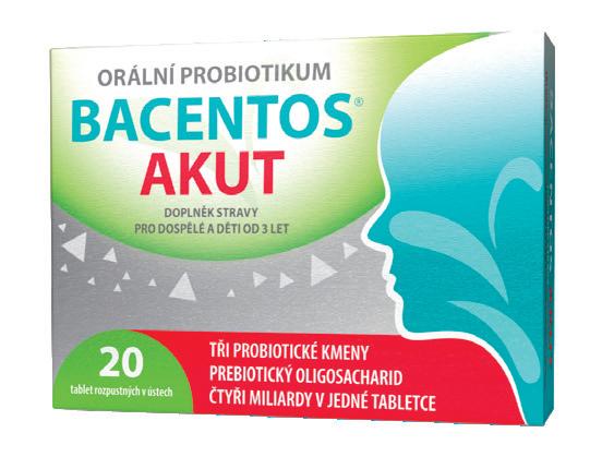 Doplněk stravy BACENTOS® AKUT obsahuje tři orální probiotické kmeny s prebiotickým oligosacharidem. Čtyři miliardy v 1 tabletě.