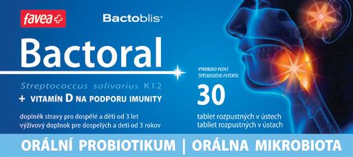 Bactoral – orální probiotikum pro doplnění zdravé ústní mikrobioty. Streptococcus salivarius K12 –tato bakterie dokáže zaujmout strategické pozice v dutině ústní, nosohltanu a středouší.