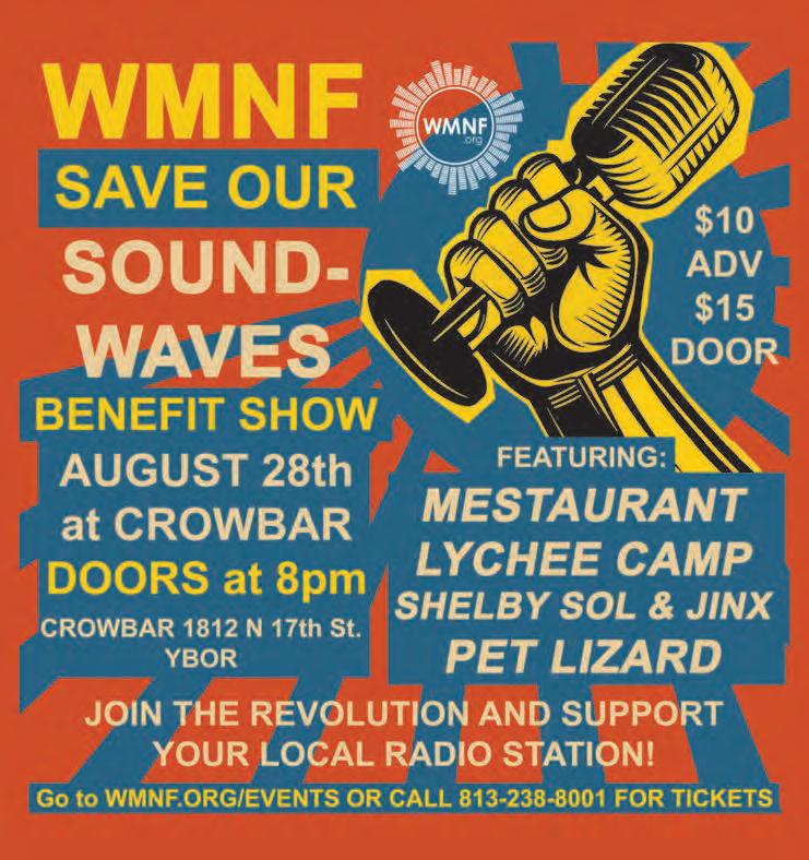 C WMNF Save Our Sound-Waves: Mestaurant w/Lychee Camp/Shelby Sol & Jinx/Pet Lizard Since its inception, community radio station WMNF Tampa has been a surefire place for homegrown bands to get their first dose of airplay. To this day, 88.5-FM remains a core supporter of local musicians, and the scene is giving back in the wake of funding cuts from Ron DeSantis and Donald Trump. This gig is anchored by Mestaurant, the drum-centric project of producer and DJ Chris Wood. Rock bands Lychee Camp and Pet Lizard round out the bill alongside a special performance from songwriter Shelby Sol and her partner, rapper Jinx. (Crowbar, Ybor City)