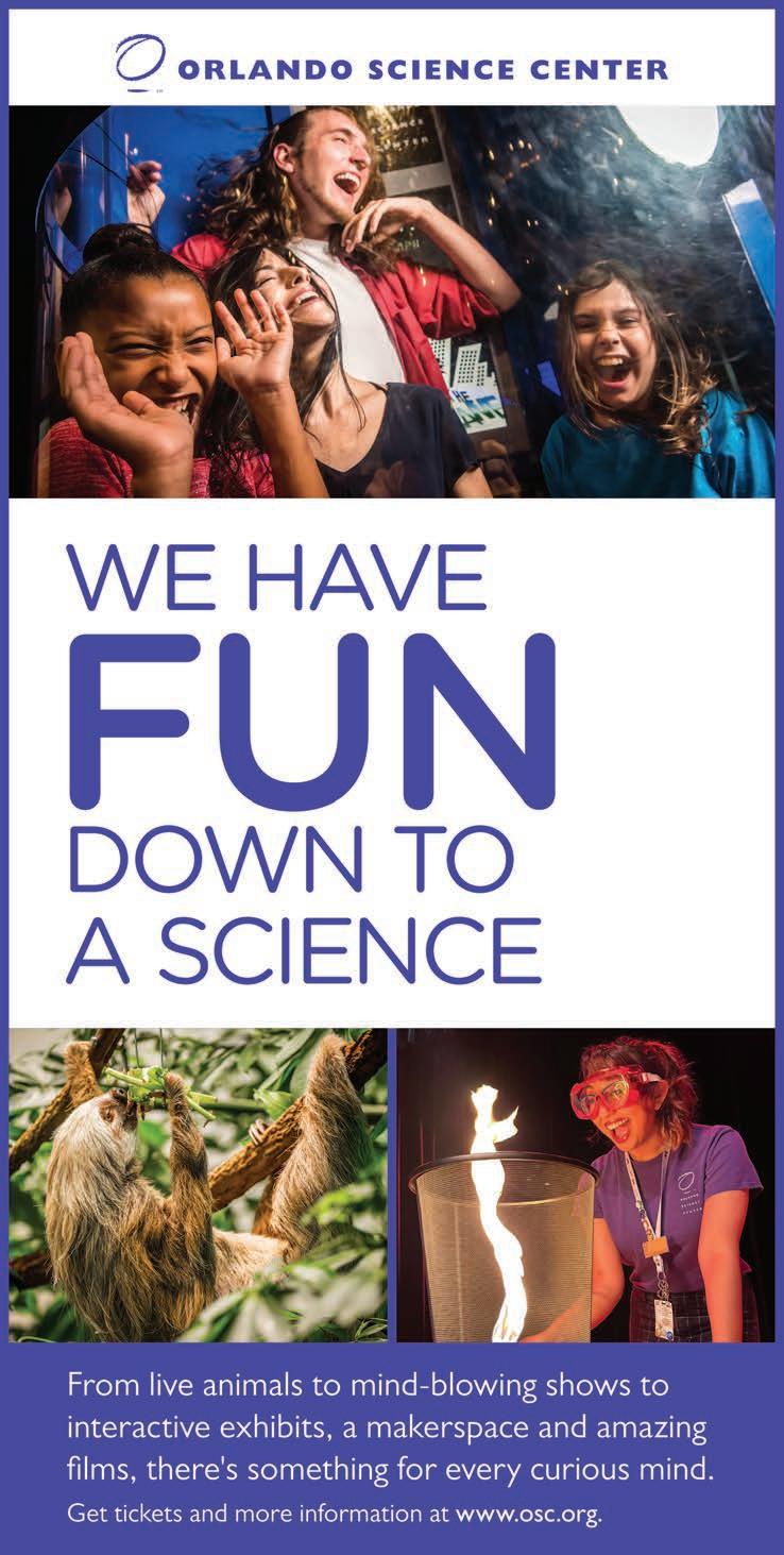 in one epic evening for adults. Enjoy everything you love about the Science Center, without the kids. Ages 18 and up only. 8-11 pm Saturday; Orlando Science Center, 777 E. Princeton St.; $20; 407-514-2000; osc.org.