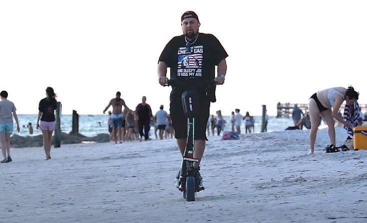 In a video shared to YouTube by Audubon Florida volunteer Bob Truesdell, the man in the black pro-Trump shirt can be seen illegally riding an e-scooter on Redington Shores Beach. He then passes the camera and swerves through a colony of threatened Black Skimmers and then runs over a protected Royal Tern.
