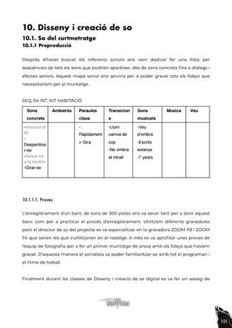 10. Disseny i creació de so 10.1. So del curtmetratge 10.1.1 Preproducció Després d'haver buscat els referents sonors ens vam dedicar fer una llista per seqüències de tots els sons que podrien aparèixer, des de sons concrets fins a diàlegs i efectes sonors. Aquest mapa sonor ens serviria per a poder gravar tots els foleys que necessitaríem per al muntatge.
