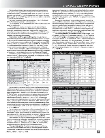 Встановлено позитивну дію біопрепарату Ризогумін на врожайність сої при внесенні як з мінеральними добривами, так і з меліорантами (дефекатом), а також при їх поєднанні. Прибавка на фоні Ризогуміну становить 5,0 ц/га при врожаї на контролі 17,5 ц/га. Таким чином, використання під сою повного мінерального добрива у сполучені з хімічною меліорацією дозволило збільшити урожайність зерна з 22,5 до 33,0 ц/га. Доповнення цих заходів інокуляцією забезпечило рівень урожайності більше на 15,5 ц/га, що проти контролю становить 189%. Вміст білку та золи був найвищим на варіантах із застосуванням інокуляції Ризогуміном у поєднанні з мінеральними добривами та дефекатом і становив відповідно 42,0% і 5,5% при показниках на контролі 31,7 і 4,2 (табл. 3). Застосування на посівах картоплі біопрепарату Хетомік не забезпечив прибавки врожайності, але в поєднанні з органічними добривами - гноєм та біопрофермом - збільшив урожай картоплі відповідно на 45 і 160 ц/га при врожаї на контролі 160 ц/га, тоді як внесення гною підвищило врожайність на 34 ц/га (табл.4). При вивченні післядії біопрепарату Хетомік на врожай картоплі встановлено, що найвищий врожай було отримано з варіанту Хетомік + сидерат (редька). Він перевищив контроль в 1,2 раза при врожайності на контролі 176 ц/га (табл. 5), що повязано з меншим ураженням посівного матеріалу хворобами. Стимулятори росту. В середньому за три роки усі стимулятори росту, незалежно від способу їх застосування, сприяли підвищенню врожаю ярої пшениці. При цьому більші прирости