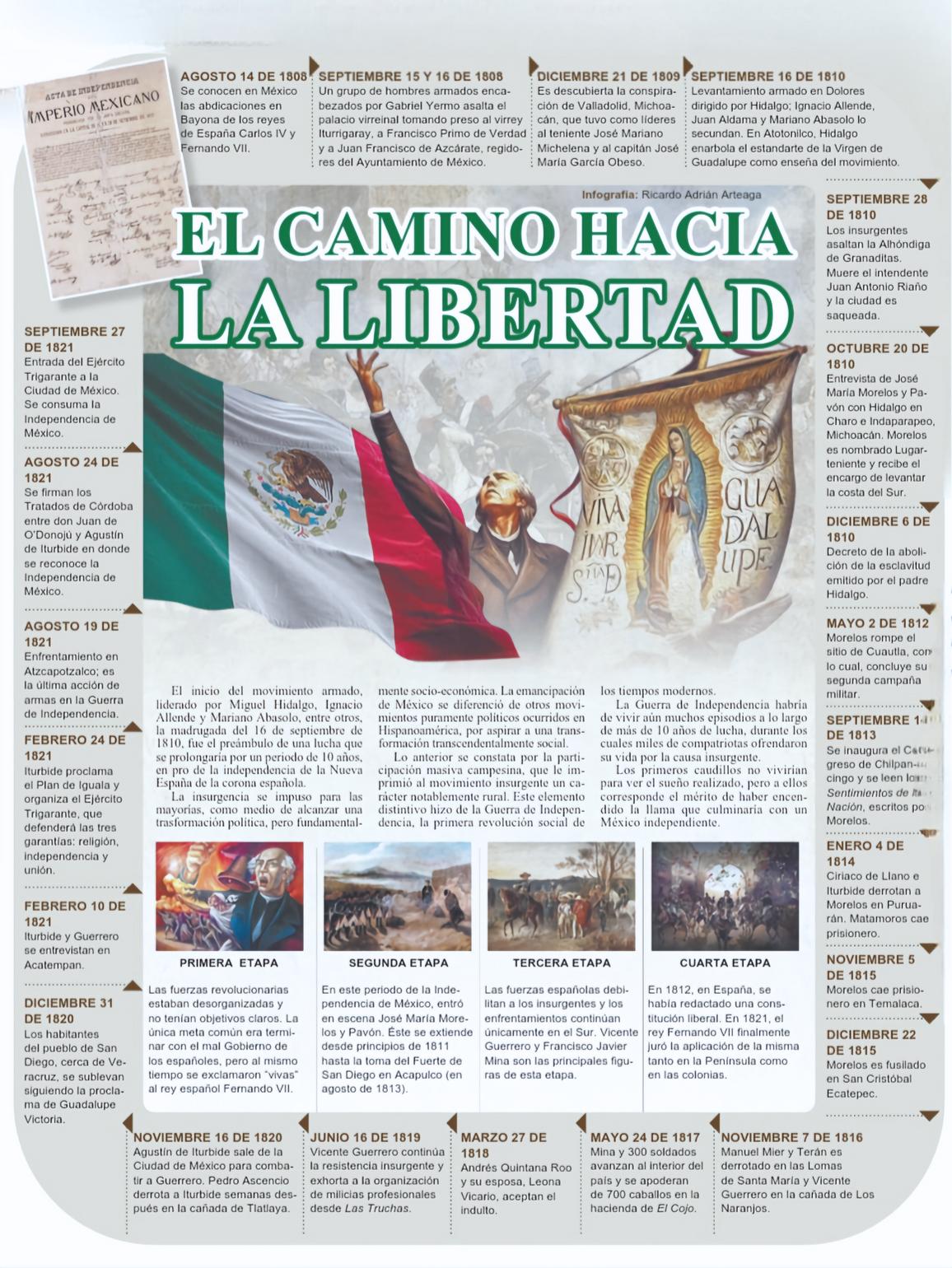 El periodo de nuestra historia conocido como la Guerra de Independencia empieza (estrictamente hablando) la madrugada del 16 de septiembre de 1810, cuando el padre Miguel Hidalgo da el llamado “Grito de Dolores” y termina el 27 de septiembre de 1821 (11 años después) con la entrada triunfal del Ejército Trigarante, encabezado por Agustín de Iturbide y Vicente Guerrero, a una jubilosa Ciudad de México El objetivo principal de este movimiento (armado y social) era liberar a nuestro territorio del yugo español y que, en cada rincón de la Colonia se olvidase por completo el concepto de virreinato.