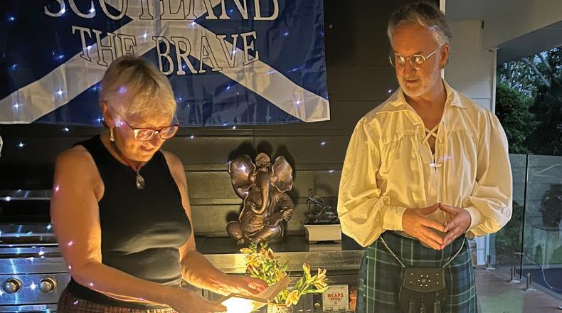Burns lived life to the fullest by all accounts but died young in 1796 at the age of 37. As well as the good food, our Eumundi Burns supper included readings of his works – including the Ode to a Haggis which customarily precedes the presentation of this dish – and later, the sharing of a selection of his songs and poetry which provided much merriment! To close the festivities in fine tradition, guests joined hands for a rousing rendition of another Burns song sung worldwide at New Year – Auld Lang Syne. Philippa Johnson