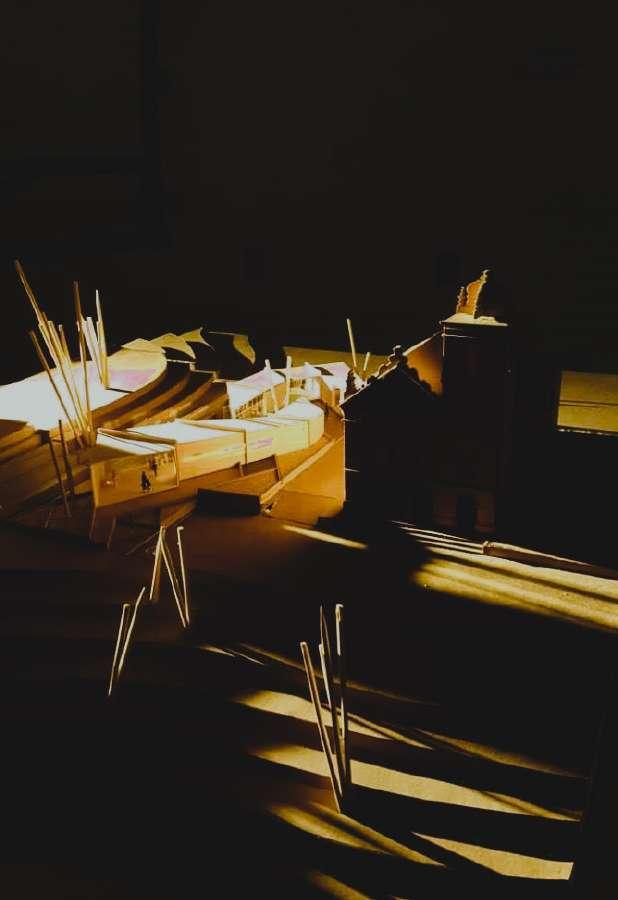 Projeto inserido no contexto Trata-se de um ensaio de incidência solar, realizado no Heliodon da FAU-UFRJ. A imagem representa o fim da tarde durante o verão.