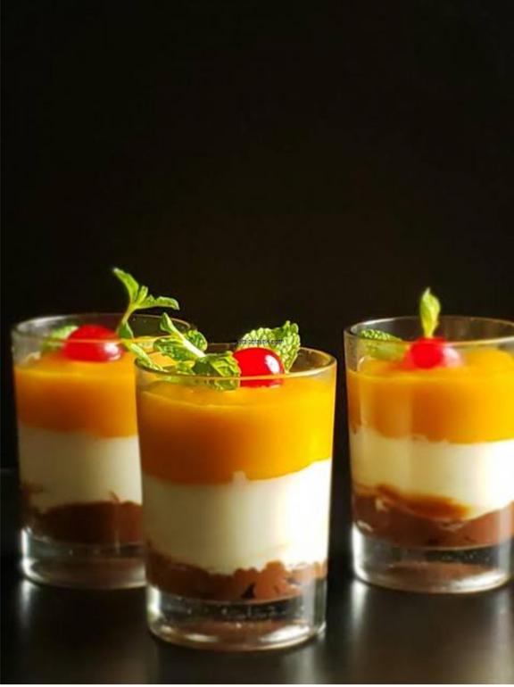 Peel the mangoes and cut them into small cubes In a saucepan, add the chopped mangoes, and ½ cup sugar Let it boil and cook on low heat until the mangoes become soft and pulpy Let it cook down for 3 mins and then add it to the blender. Blend it nicely until it turns into a puree Keep this in the refrigerator until the Mousse is ready In a bowl, melt the white chocolate in the microwave Take another bowl and heat the heavy cream over medium heat Keep stirring Add the melted white chocolate and let it cool After some time, add the Vanilla Extract to the batter and beat it with an electric mixer until soft peaks are formed Transfer this mixture to a piping bag Powder the Salt Crackers by crushing them into pieces Take a glass, and add a thin layer of the crushed crackers Then, add a layer of the mango puree, then the mousse. Repeat this step twice Add a mint leaf for garnish!