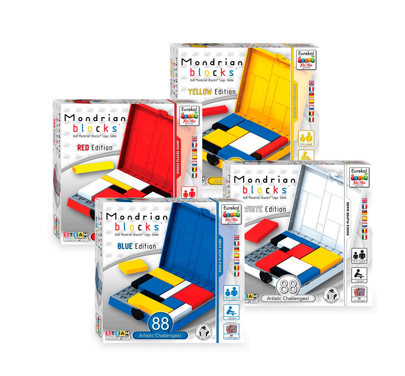 La serie di giochi di logica a blocchi Mondrian 8 x 8 esiste in 4 edizioni: rossa, gialla, blu e bianca.