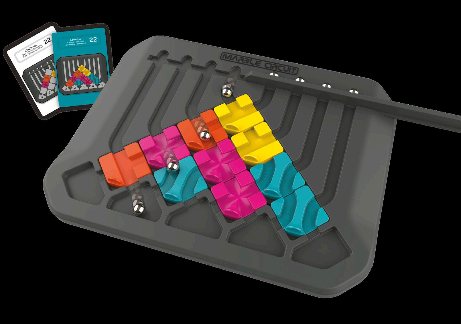 The Goal: Choose a challenge card and place the starting tiles on the board as indicated on the card. Note the numbers in the target spaces on the card. These numbers indicate the number of marbles that should end in these spaces. Predict the paths of the marbles and add the remaining mystery tiles. Slowly slide the gate to the right to release the marbles.
