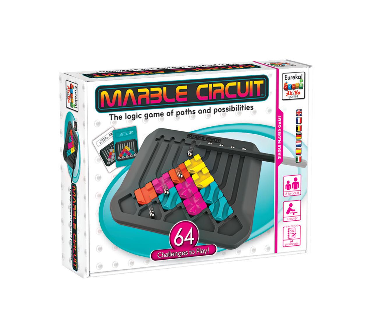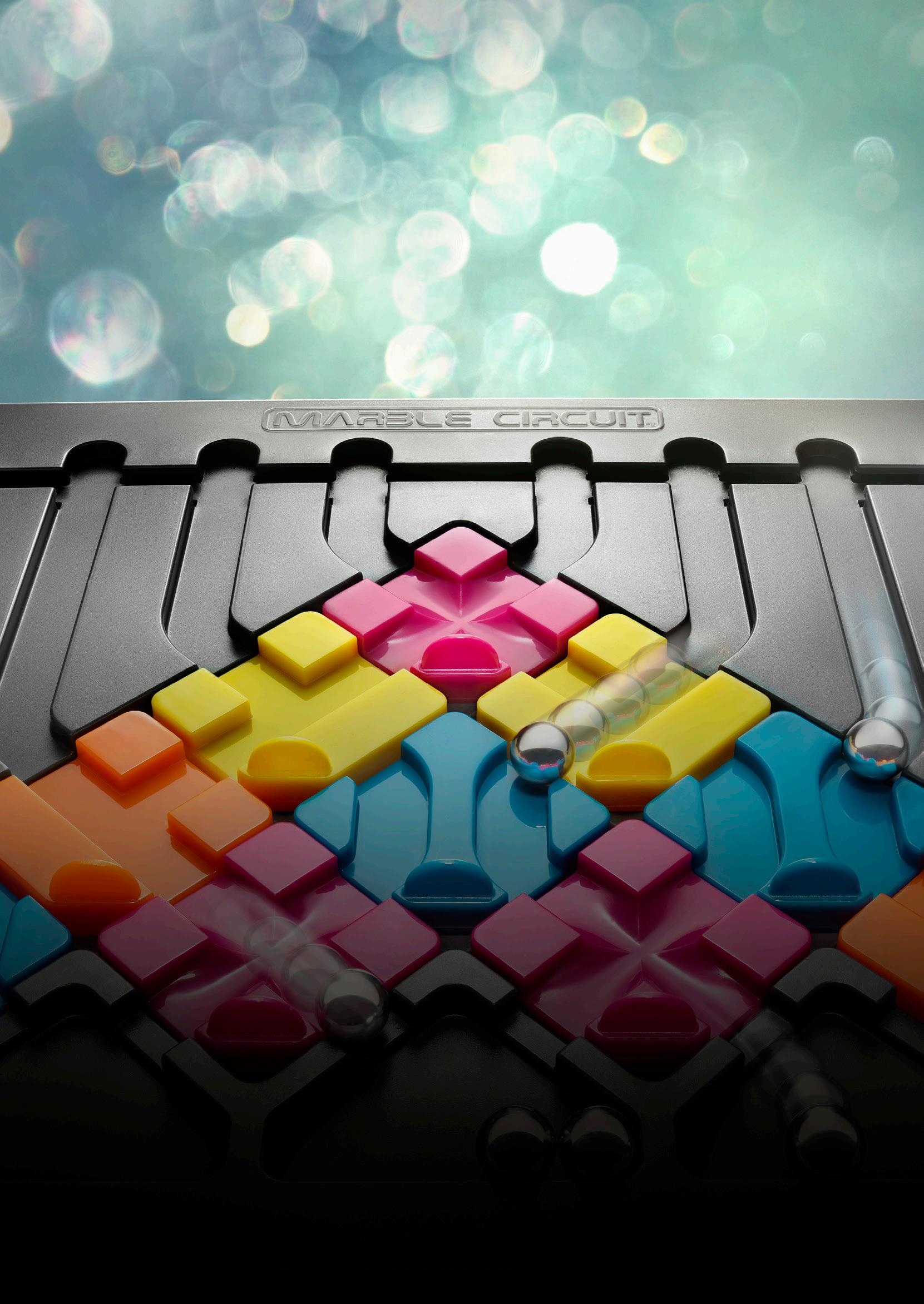 The Goal: Choose a challenge card and place the starting tiles on the board as indicated on the card. Note the numbers in the target spaces on the card. These numbers indicate the number of marbles that should end in these spaces. Predict the paths of the marbles and add the remaining mystery tiles. Slowly slide the gate to the right to release the marbles.
