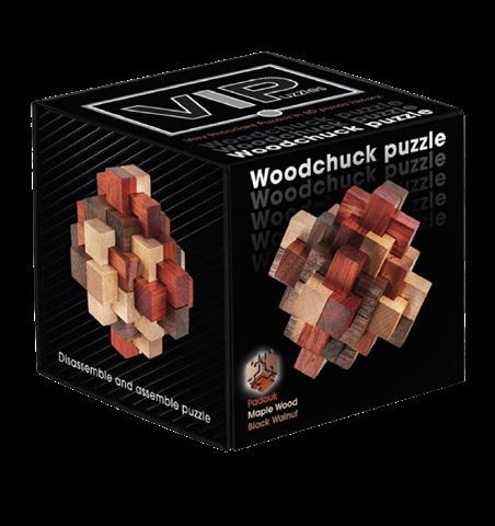 The chuck puzzle system was invented and patented by Edward Nelson in 1897. Improved by Ron Cook of the UK company Paradox Eng. Ltd. AKA Pentangle Puzzles, during the 1980s and 90s. They produced a series of chucks in which a given number of simple bridge-like pieces and one or more key pieces with an extra notch, could be built into a variety of self-sustaining threedimensional shapes. For creating bigger chuck puzzles, at that time named Papachuck (54 parts), Grandpapachuck (96 parts) and Great-Grandpapachuck (150 parts) by Cook, one would need to add longer pieces. This idea can also be used to create asymmetric shapes, assembled exactly according to the same principle as this Woodchuck puzzle. This feature is unique to chuck puzzles.